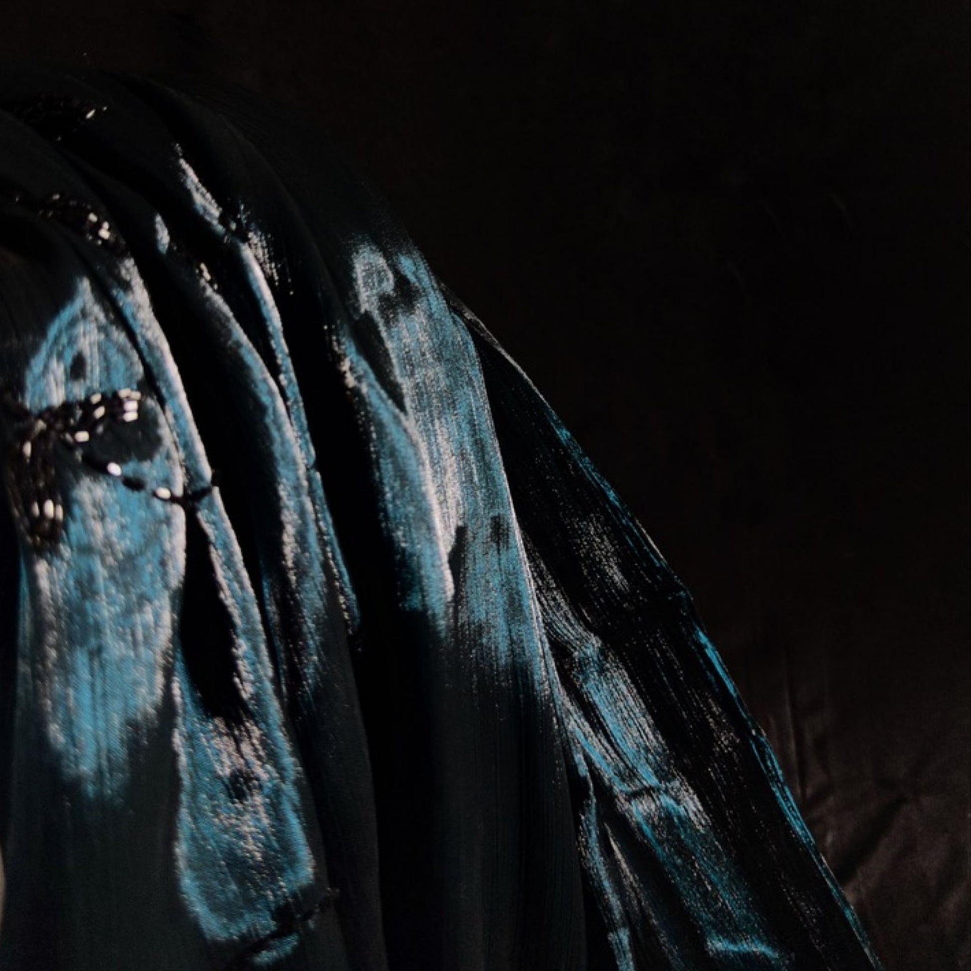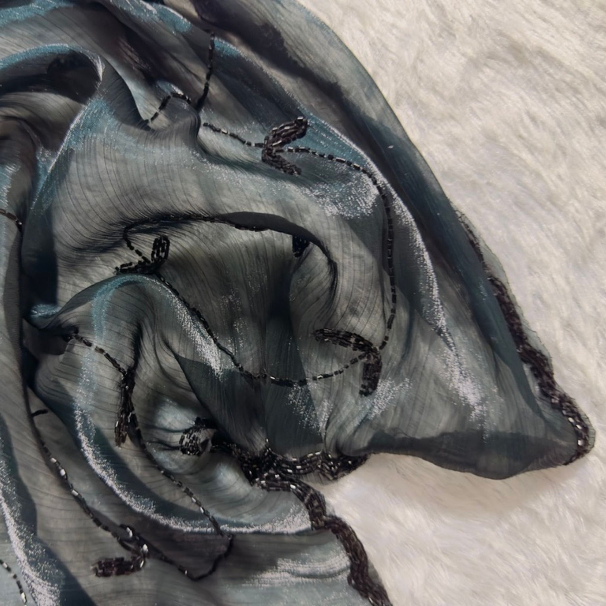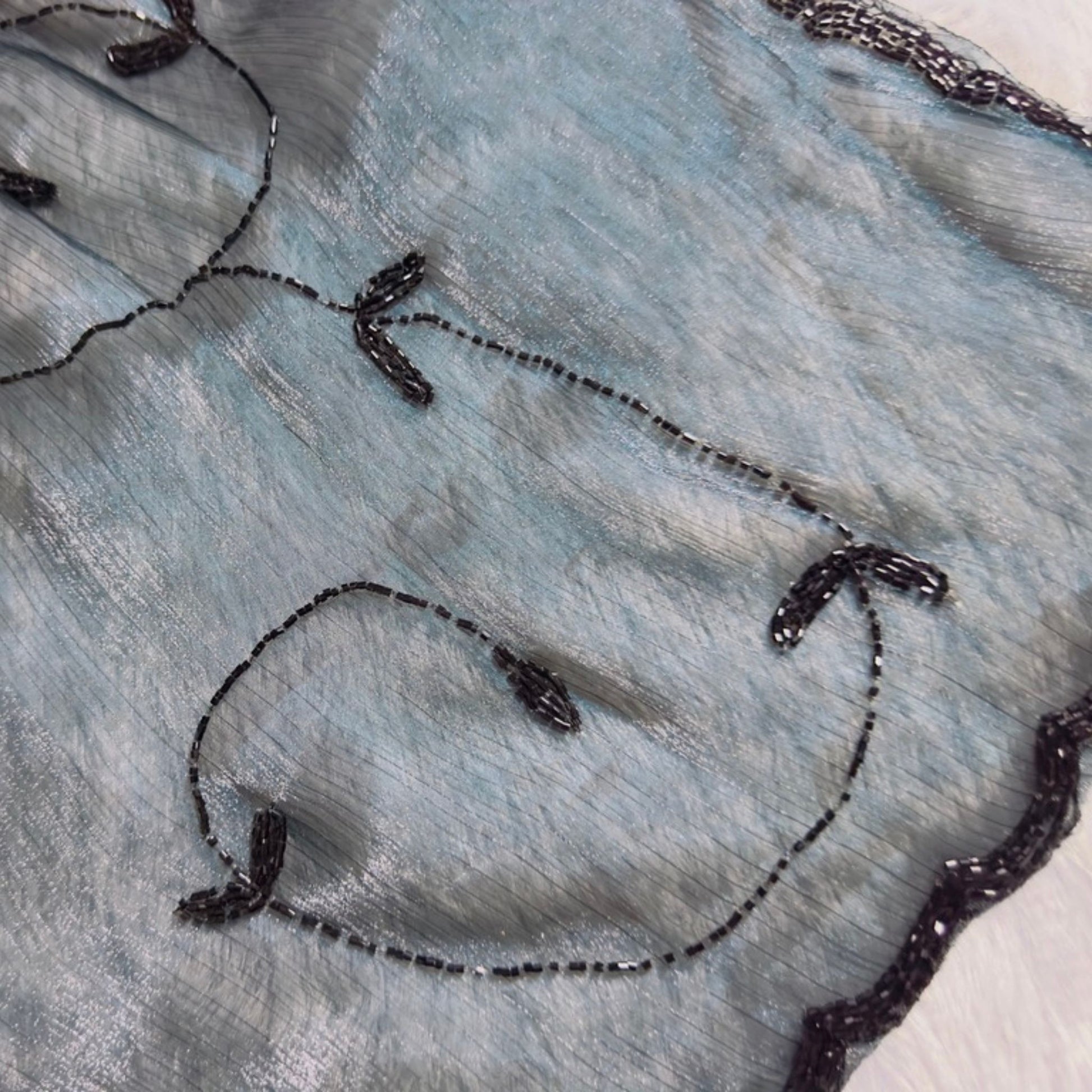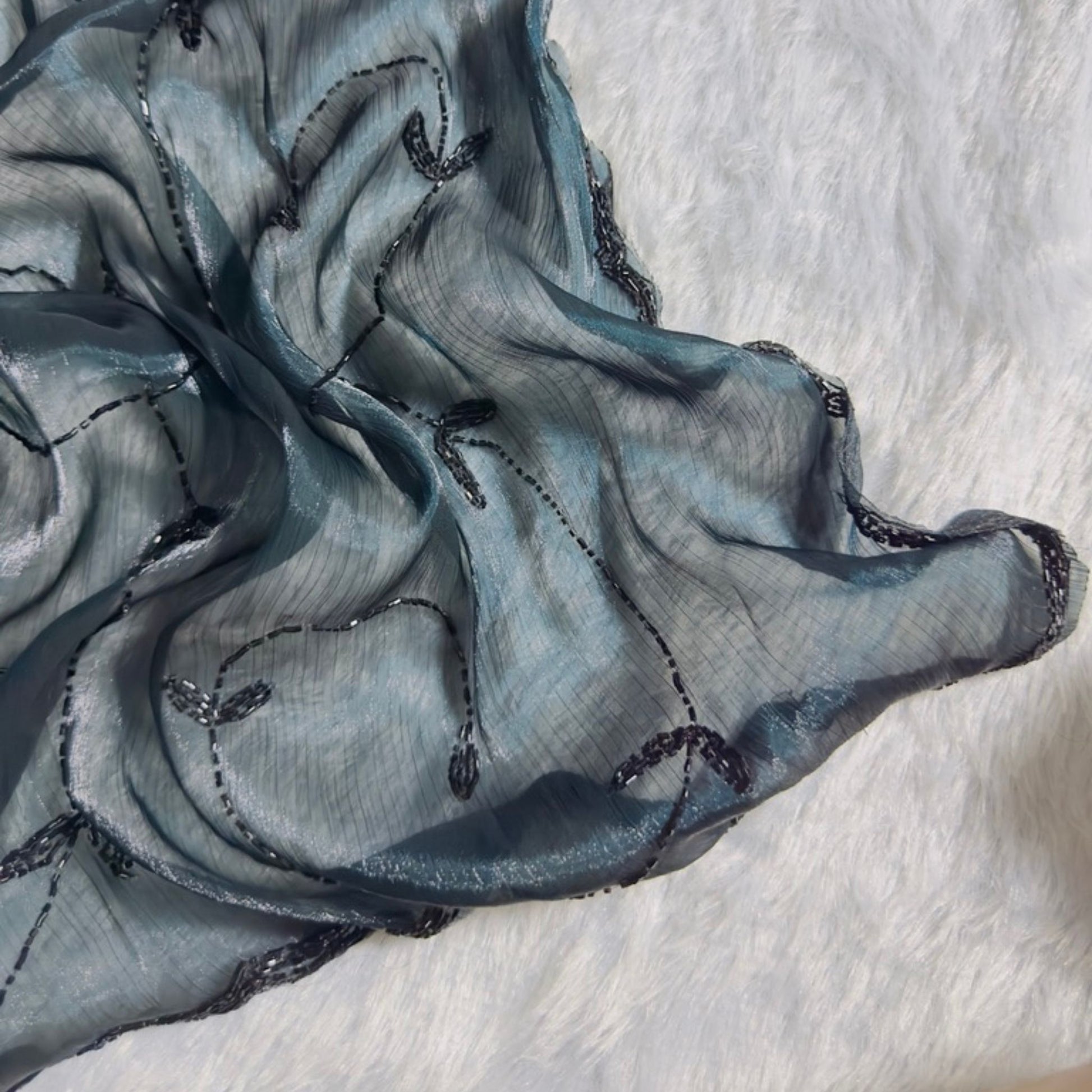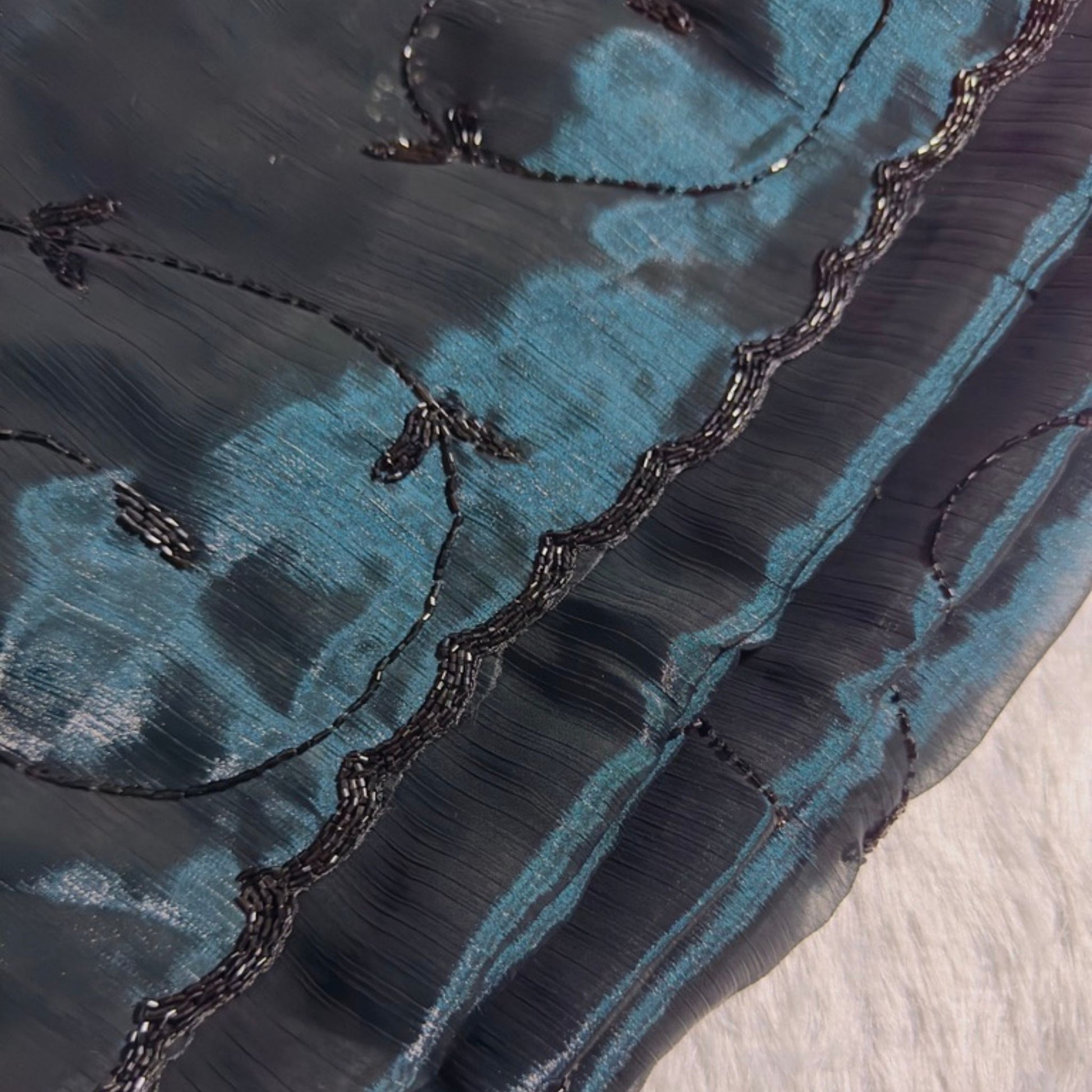 Inkveil is a stunning sheer blue sari with intricate black embroidery, perfect for adding a touch of elegance .