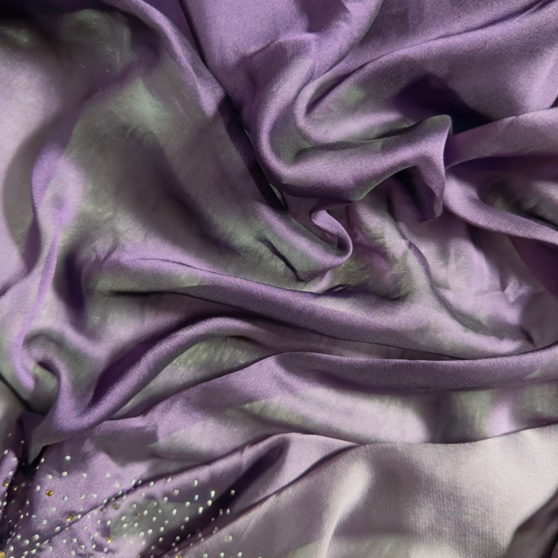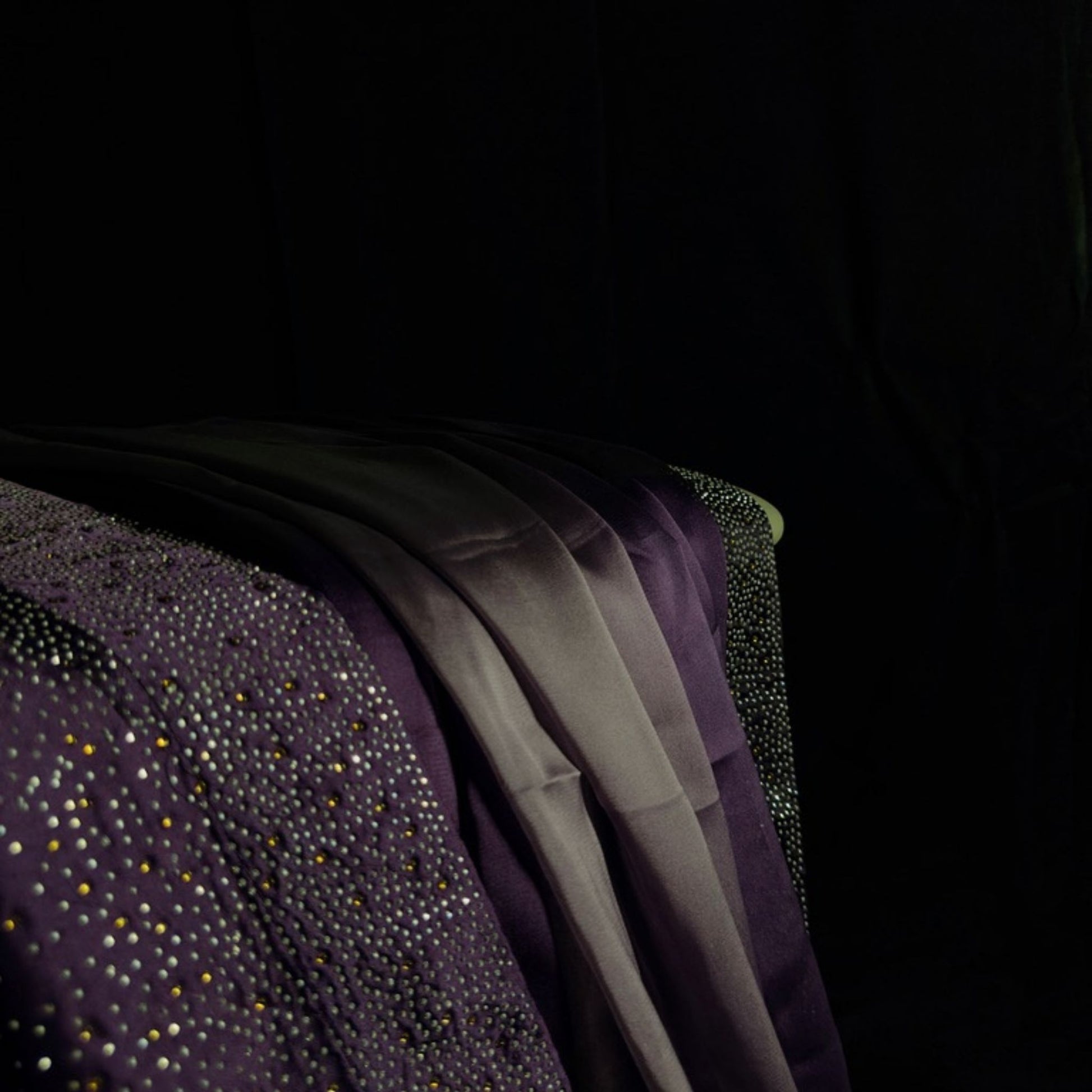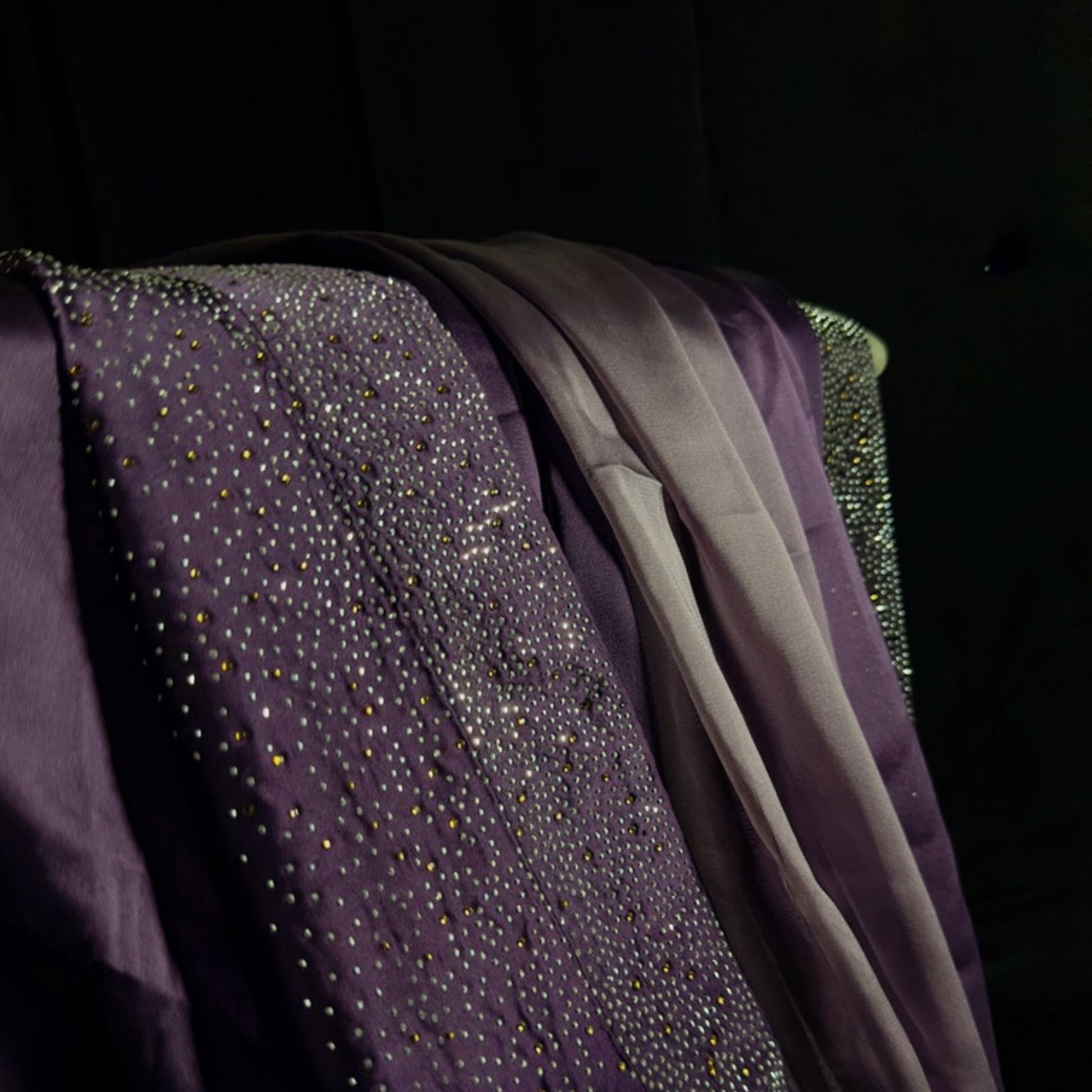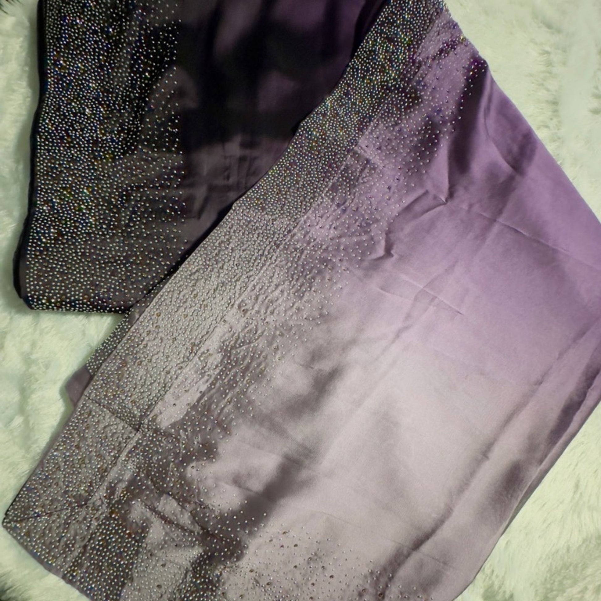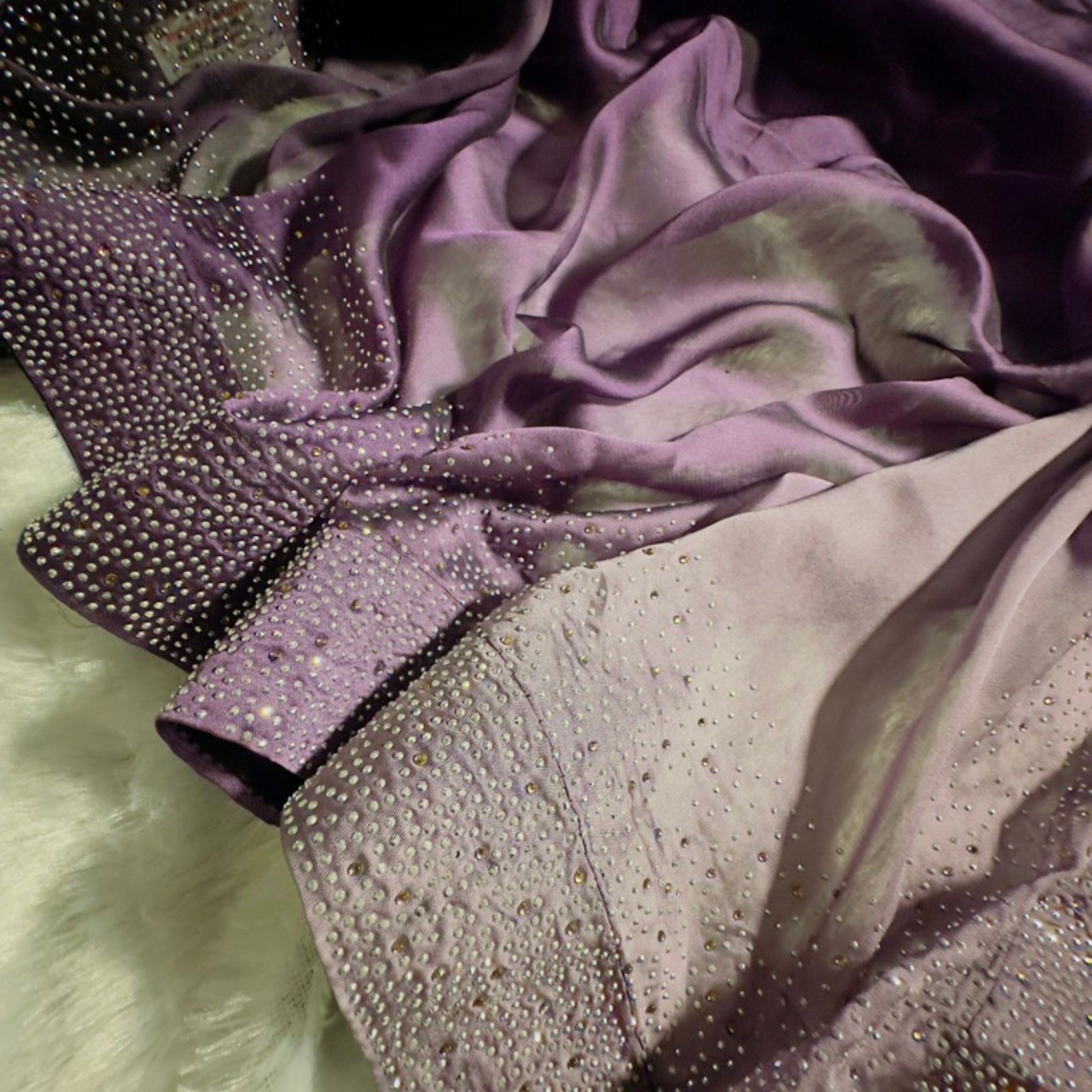 Indulge in the elegance of Lavender Haze, a luxurious Sari garment featuring rich purple fabric and sparkling embellishments. Elevate your wardrobe with this exquisite piece.