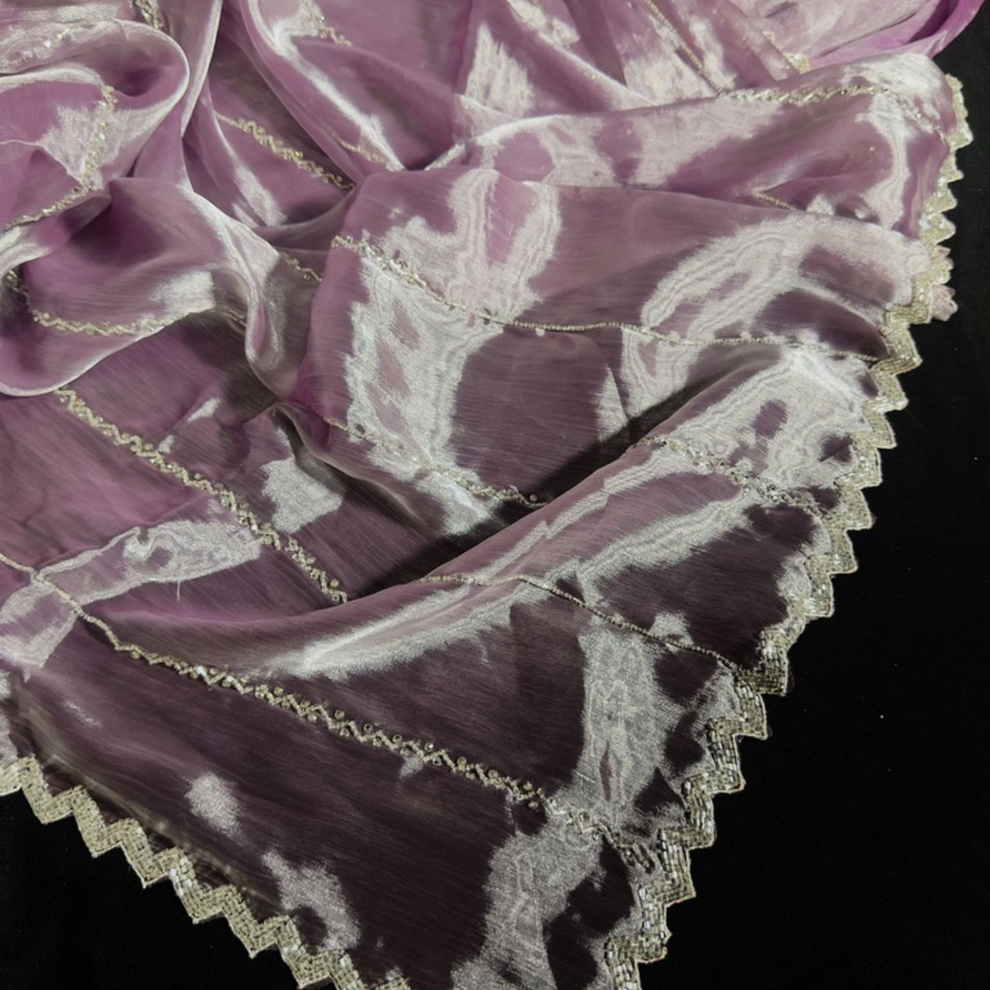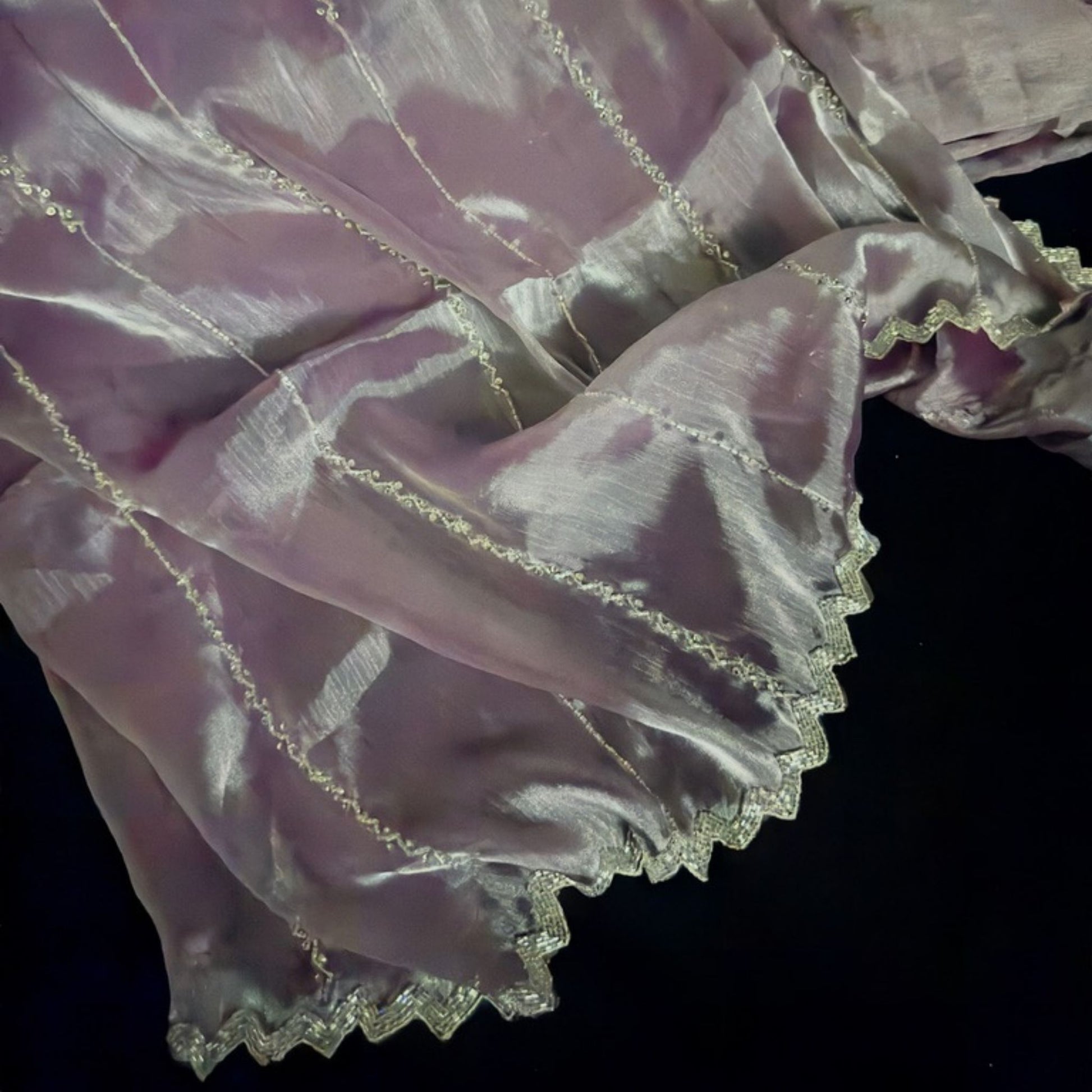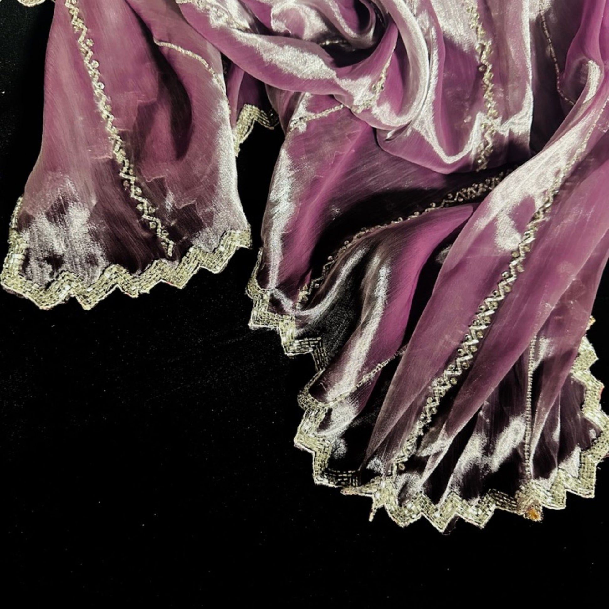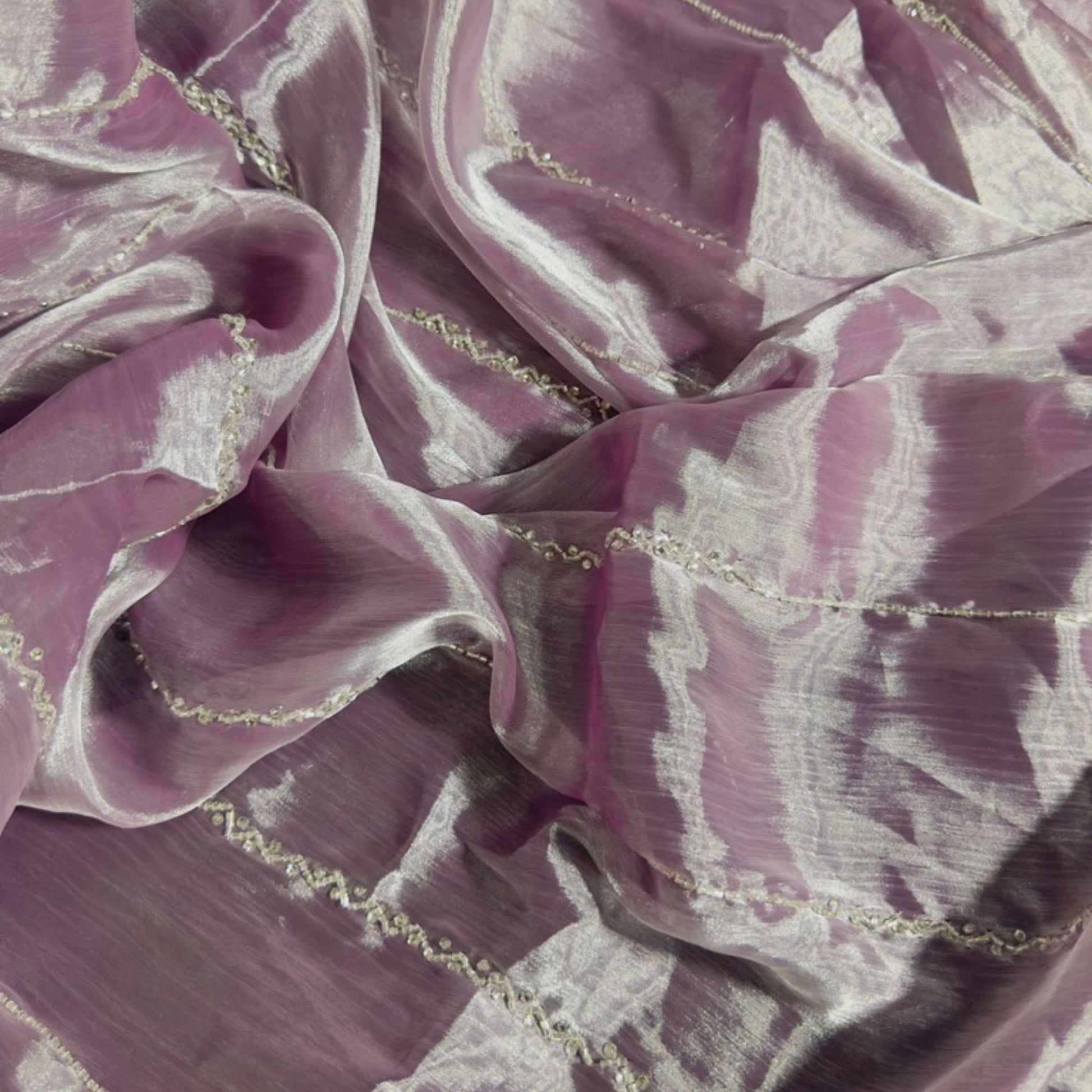 Introducing Moonmilk, a luxurious purple fabric adorned with intricate silver trim. This elegant piece is perfect for adding a touch of glamour to any woman's wardrobe.